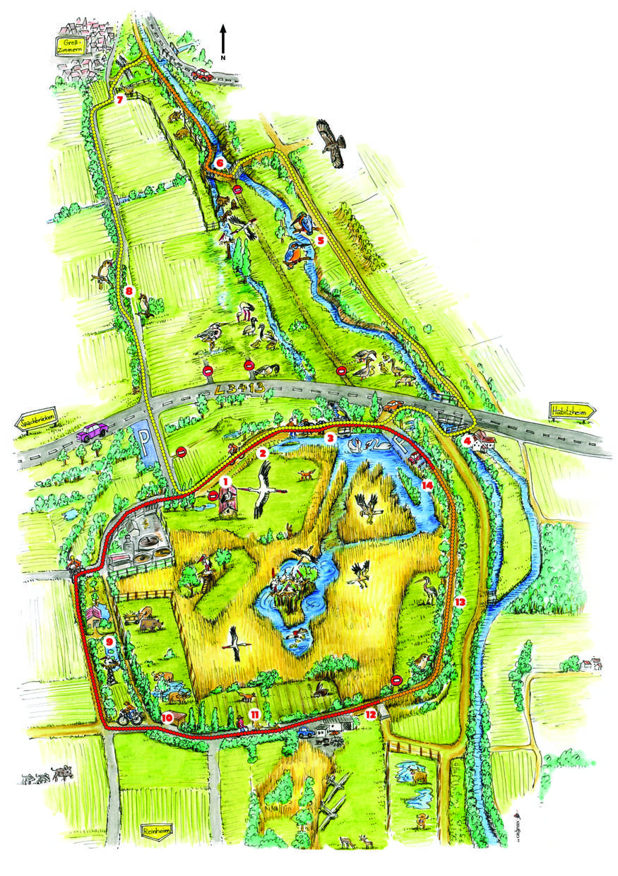 Achtung: Durch die Aktivitäten der Biber können die Wiesen an der Scheelhecke zeitweise unter Wasser stehen, so dass die Brücke nicht trockenen Fußes zu erreichen ist. Als alternativer Rückweg bietet sich dann der obere Weg auf dem Höhenzug von Klein-Zimmern zur Tannenmühle an.